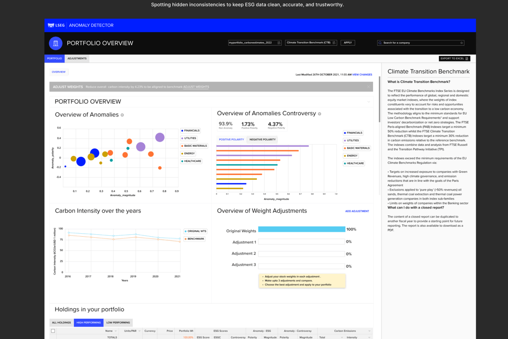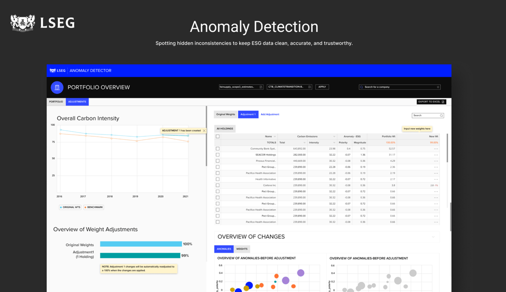 LSEG’s ESG Anomaly Detection framework strengthens the quality and credibility of sustainability data by flagging values that don’t align with expected sector, geographic, or peer benchmarks. It gives investors, issuers, and regulators clearer, more reliable ESG insights — helping them make stronger, data-backed climate and sustainability decisions.